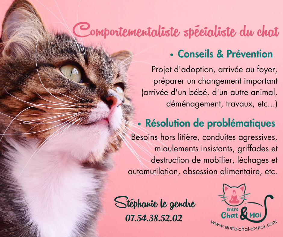 L’intervention de Stephanie de « Entre chats et moi » a été salvatrice pour la résolution de notre problématique. Stephanie, a un sens de l’explication, de l’écoute et les connaissances pour nous/vous donner toutes les clés nécessaires utiles à un mieux être entre notre chat et nous. Merci, pour notre Mino et nous. N’hésitez pas une seconde à faire appel à elle, vous pouvez foncer les yeux fermés. Nous recommandons +++ et n’hésiterons pas à donner son contact à quiconque aura besoin.